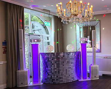 Our Premium Package is our most popular with beautiful uplit pillers and curved DJ Booth. White DJ Speakers for that added Premium touch.